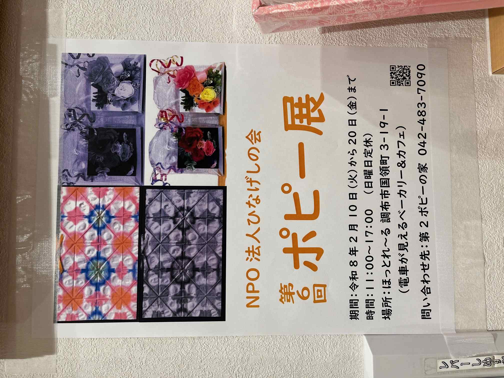 2月10日から20日まで国領駅近くの「ほっとれーる」で「ポピー展」を開催しています。みんなのアート作品の展示だけではなく、花かごなどの販売もしています。ぜひ、お茶をしながら鑑賞していただけたら嬉しいです。